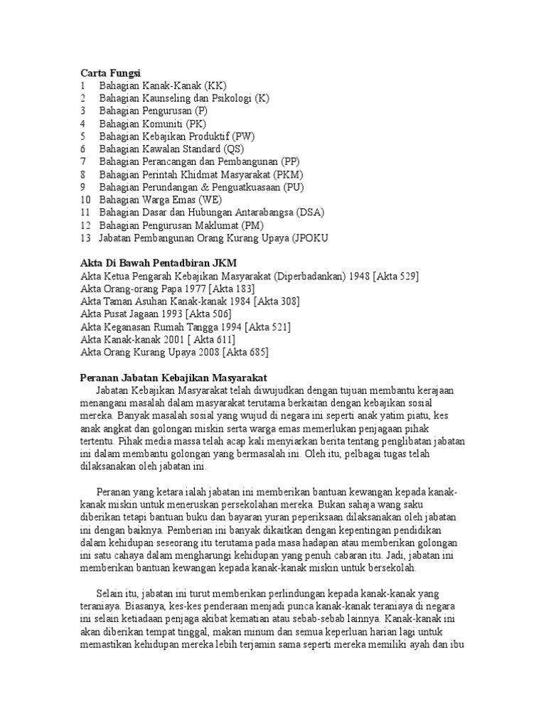 Justeru dasar perlindungan kanak-kanak amat perlu pada masa ini bagi menggalakkan setiap agensi organisasi dan anggota masyarakat memberi keutamaan kepada perlindungan kanak-kanak sebagai tanggungjawab bersama. Jabatan Kesihatan dan Kebajikan Sosial. Jawatan Kosong Kerajaan dan Swasta 2016 menampilkan Jawatan Kosong Jabatan Kebajikan Masyarakat Mei 2016Jawatan ini melibatkan Kementerian Pembangunan Wanita Keluarga dan Masyarakat.