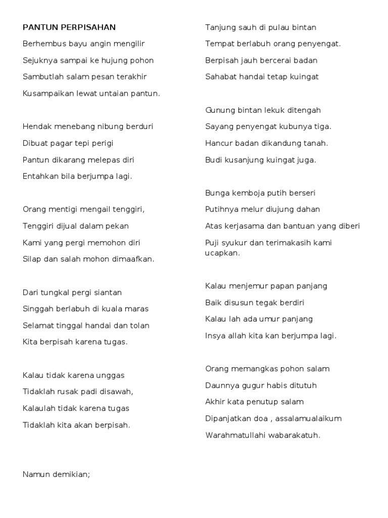 Dihimpunkan puluhan pantun 2 kerat dalam pelbagai tema dengan susunan pantun bermula pangkal A hingga Z. Siram Aglonema dengan Cairan Ajaib Ini Dijamin Tunas Tumbuh dalam Jumlah Banyak. 25 Pantun Perpisahan Sekolah Upload Jadi Status atau Caption Media Sosial saat Perpisahan Sekolah.